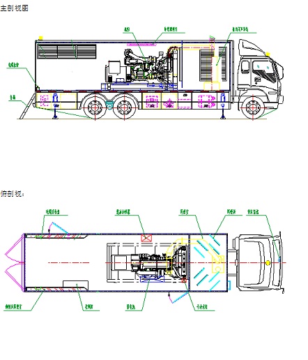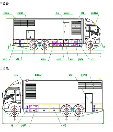 1.2、整車總體布局:箱體與車頭為整體式結(jié)構(gòu),采用箱式貨車改制,箱體采用鋼骨架及蒙皮、內(nèi)部填充消音吸聲材料,箱體分成三個(gè)獨(dú)立區(qū)域,即排風(fēng)降噪聲區(qū)、機(jī)組設(shè)備工作區(qū)、后艙輔助設(shè)備區(qū)(進(jìn)氣消聲、電纜線放置區(qū))。機(jī)組設(shè)備工作區(qū)內(nèi)設(shè)置有康明斯柴油發(fā)電機(jī)組、進(jìn)風(fēng)消音風(fēng)道、防爆照明燈、快速輸出插座等。后艙輔助設(shè)備區(qū)內(nèi)設(shè)備有動(dòng)力輸出線纜、進(jìn)氣消音、等裝置。